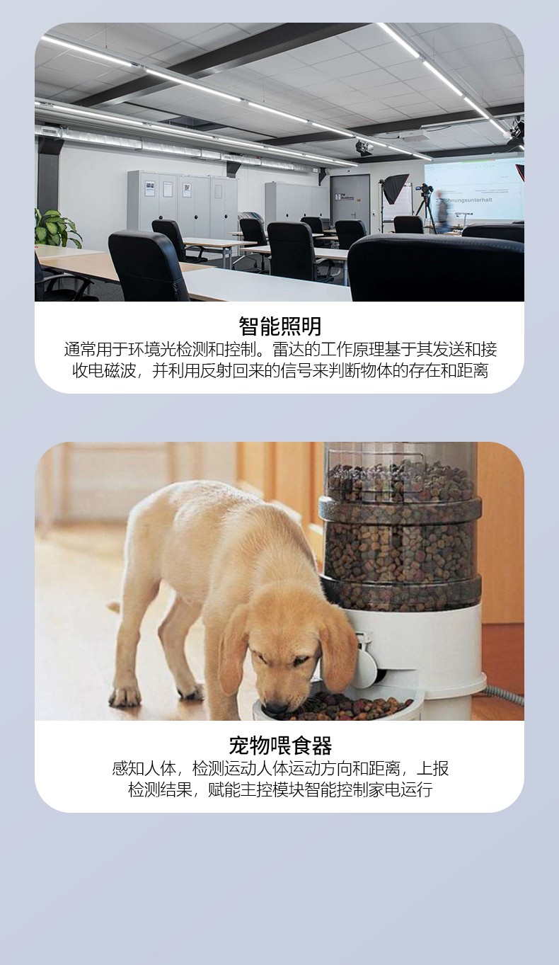 FR58L4LS-2020M-2 简称 2020M 是飞睿智能推出的高性能低功耗 5.8G 雷达传感器,雷达模块利用多普勒原理,通过天线发射高频电磁波并接收初期反射波,以此判断覆盖范围内物体的移动,给出相应电信号。模块尺寸 20*20MM,该模块集成了 5.8G 微波电路、中频放大电路以及信号处理器,集成度高且生产一致性好,模块内置32 位 MCU 和收发天线,大大提高了传感器的感应性能。雷达模块感应距离远、角度广、无死区、透镜和透镜老化问题不受温度、湿度、气流、灰尘、噪声、亮暗等影响。模块内植入滤雨树叶算法,能过滤掉雨水树叶的误触发,性能稳定,广泛应用于智慧照明、智慧安防等多个领域。